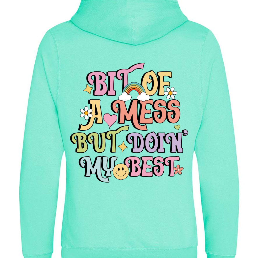 With the humorous design "Bit of a mess but doin' my best," colourful slogan, this hoodie will keep you warm and comfortable while also making a statement.