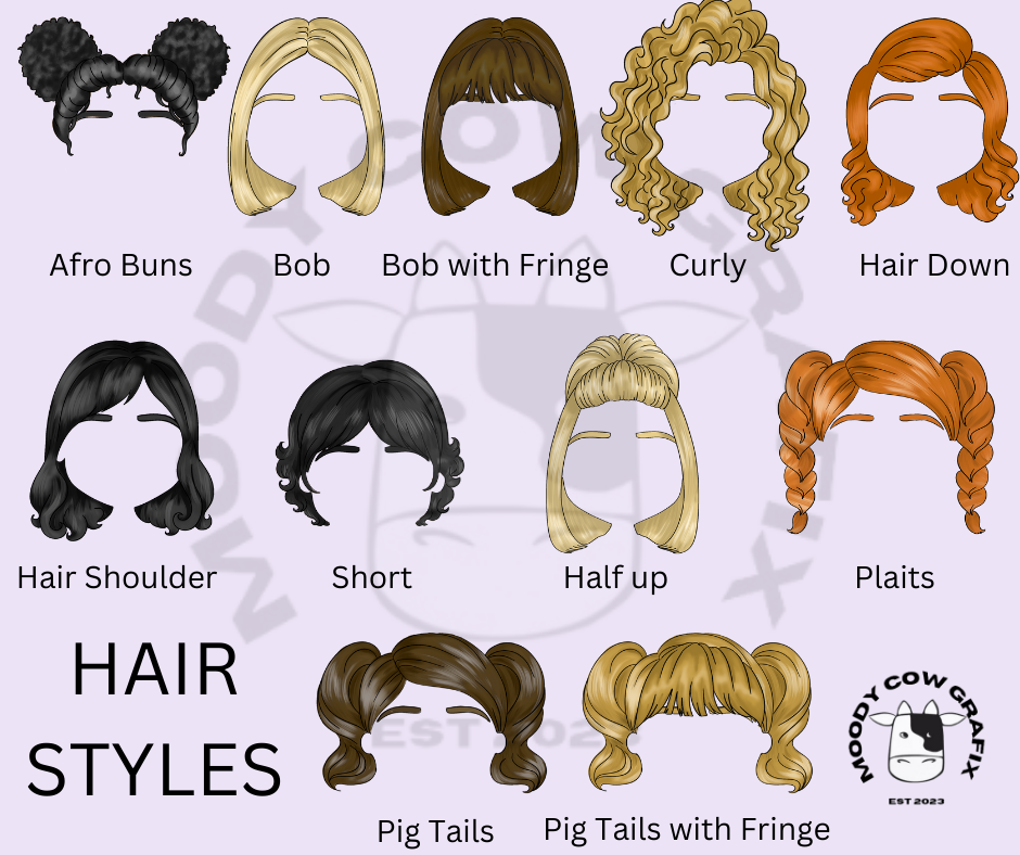 The hair style can be Afro Buns, Bob, Bob with Fringe, Curly, Hair Down, Hair Shoulder Length, Short, Half up, Plaits, Pig Tails or Pig Tails with Fringe