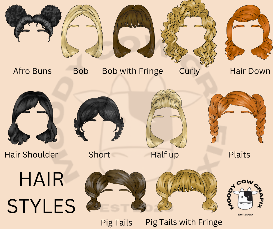 The hair style can be Hair Down, Pigtails, Bob with fringe, Plaits, Short, Half up, Curly, Pigtails with fringe, Afro Buns, Hair Down and Bob.