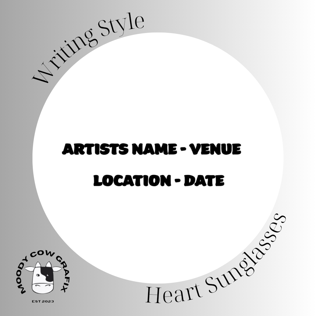These are designed with options for concerts, they are personalised with Artists Name, Location and Date.