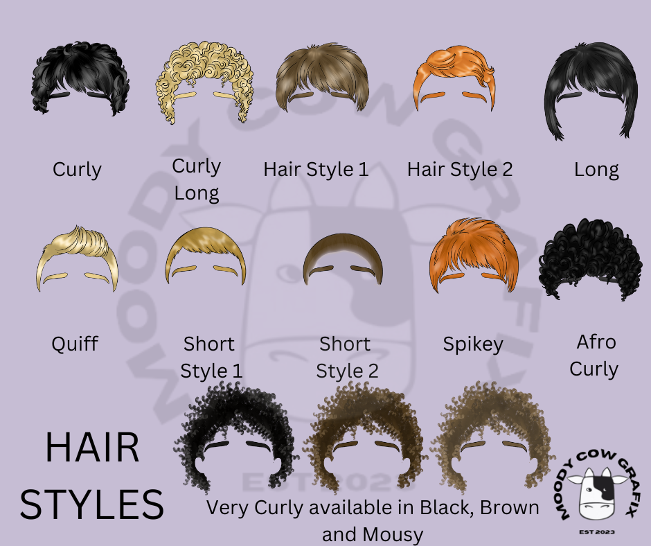 The hair style can be Curly, Curly Long, Hair Style 1, Hair Style 2, Long, Quiff, Short Style 1, Short Style 2, Spikey, Afro Curly (Only available in Black) or Very Curly Afro (Only available in Black, Brown or Mousy)